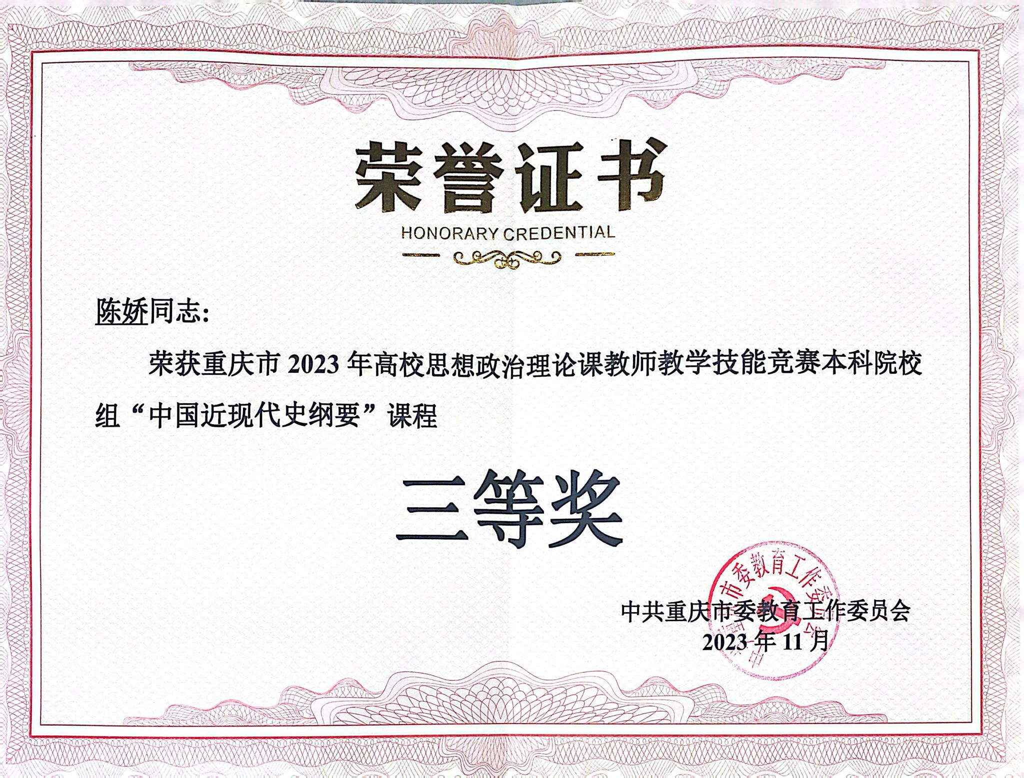 图为陈娇老师荣获“中国近现代史纲要”课程三等奖