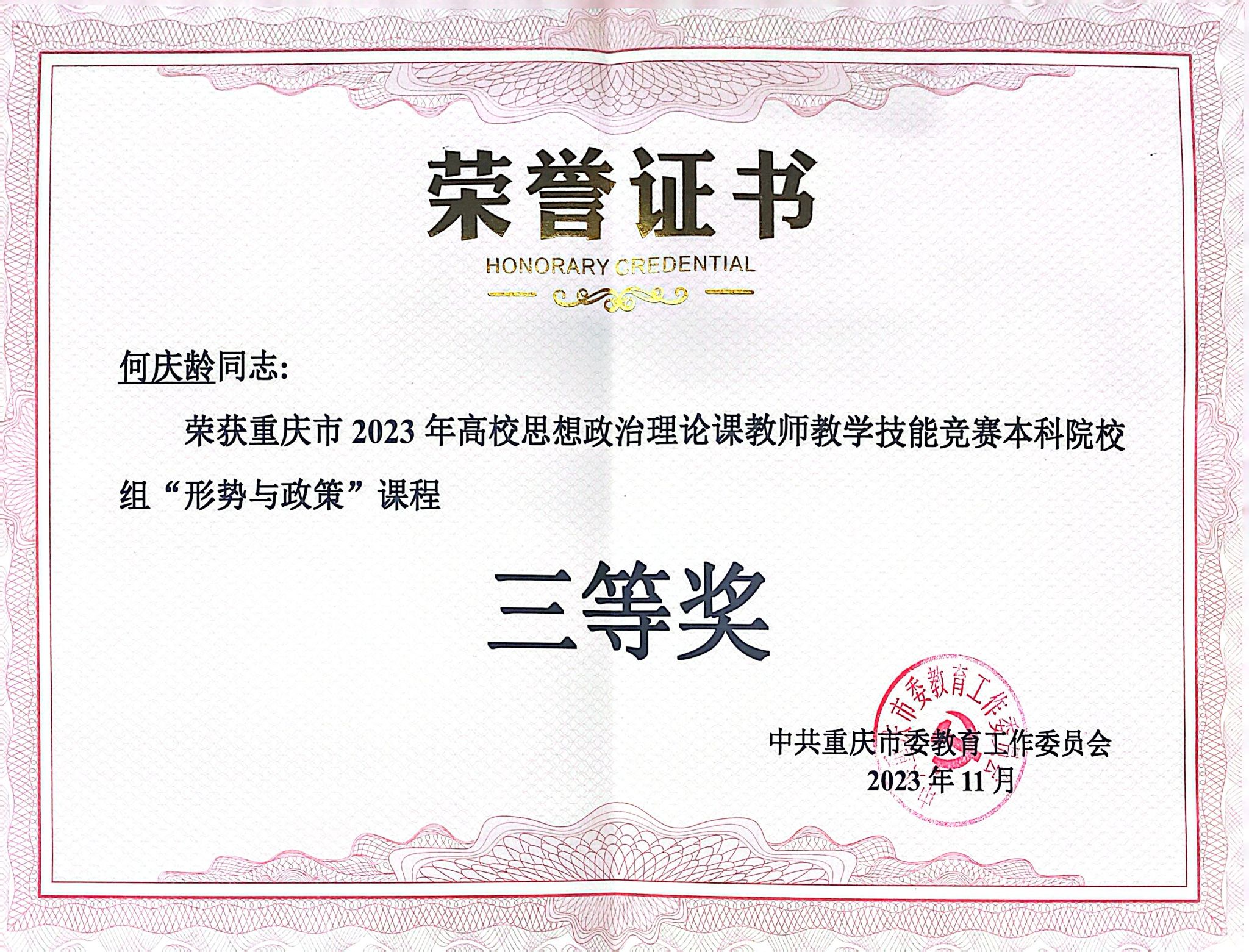 图为何庆龄老师荣获“形势与政策”课程三等奖