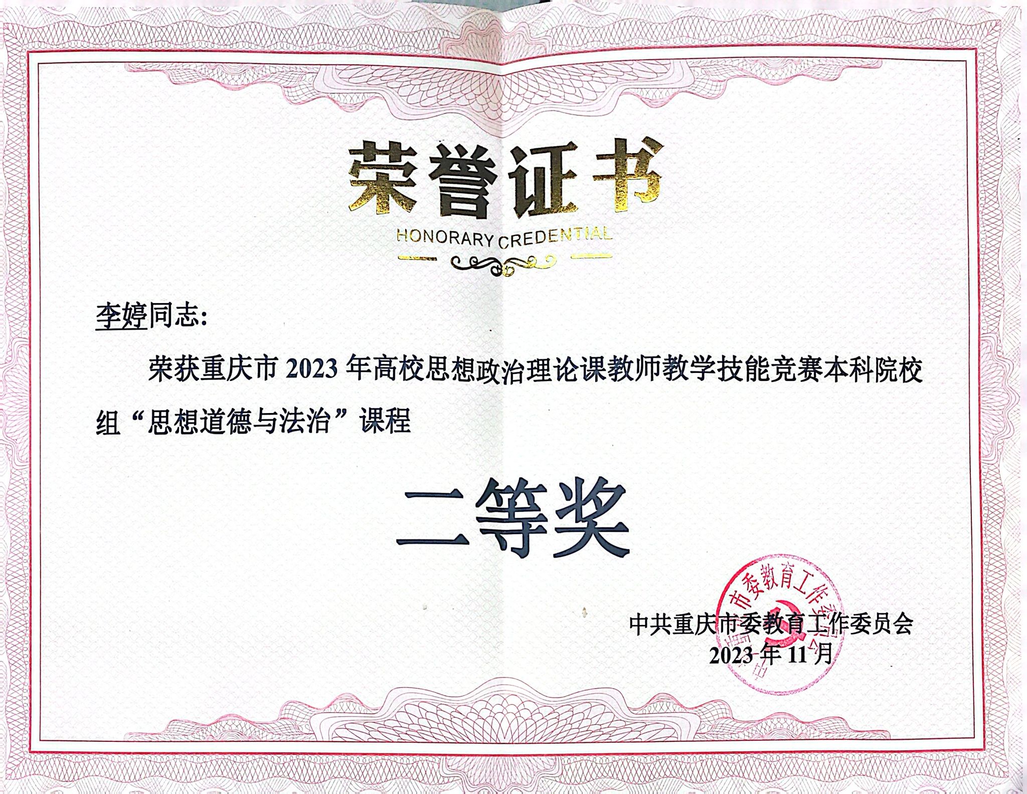 图为李婷老师荣获“思想道德与法治”课程二等奖