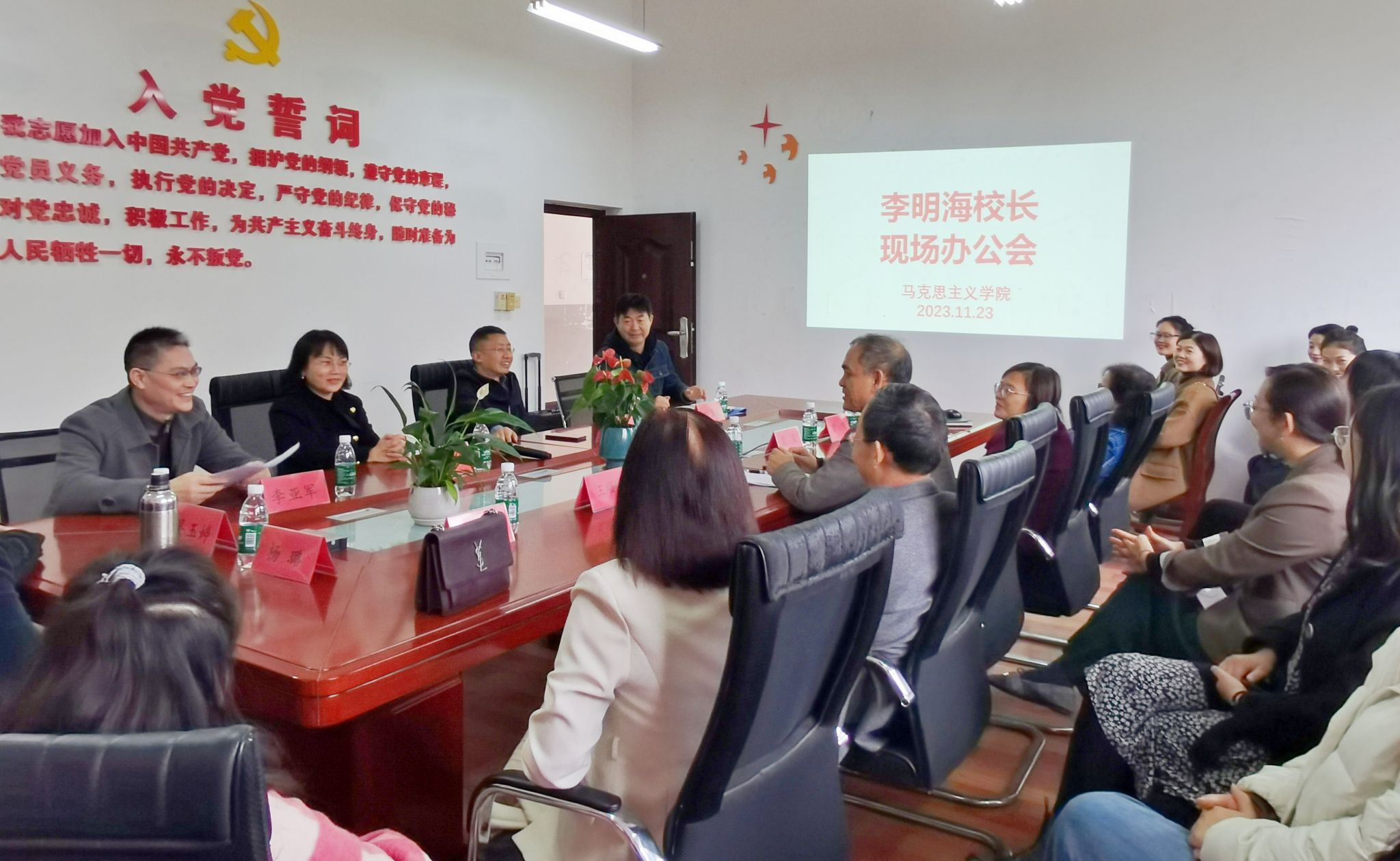 2023年11月23日下午,马克思主义学院会议室掌声雷动,欢迎李明海校长下沉学院调研,并主持召开现场办公会,面对面研究推进马克思主义学院建设的相关事宜。驻校理事、人事处处长刘卫民,学院副院长李亚军、副院长史丽涛以及马克思主义学院全体教师参会。