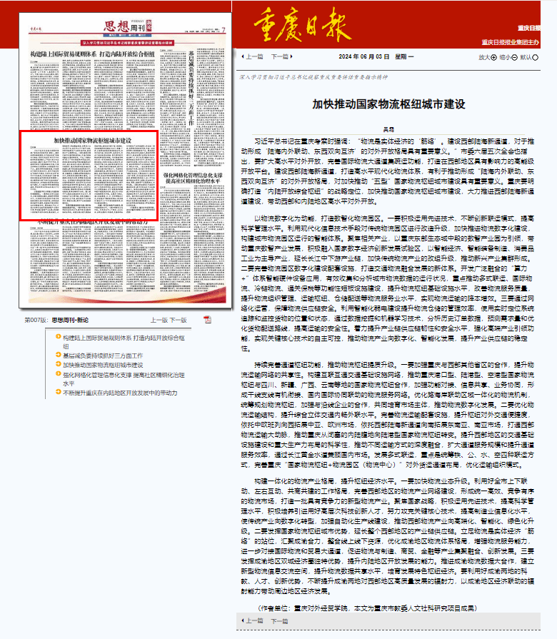 6月3日,《重庆日报》第7版“思想周刊新论”栏目刊发我院吴霜老师“加快推动国家物流枢纽城市建设”署名文章,该文章是重庆市教委人文社科研究项目成果展示,集中体现了高校思政课教师深入学习贯彻习近平总书记视察重庆重要讲话重要指示精神。(吴霜,讲师,赣南师范大学硕士研究生毕业,现为马克思主义教师)