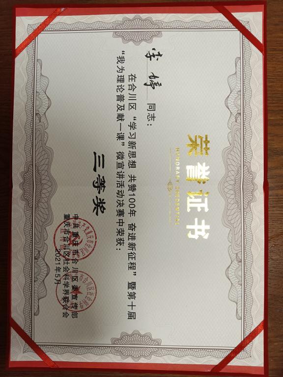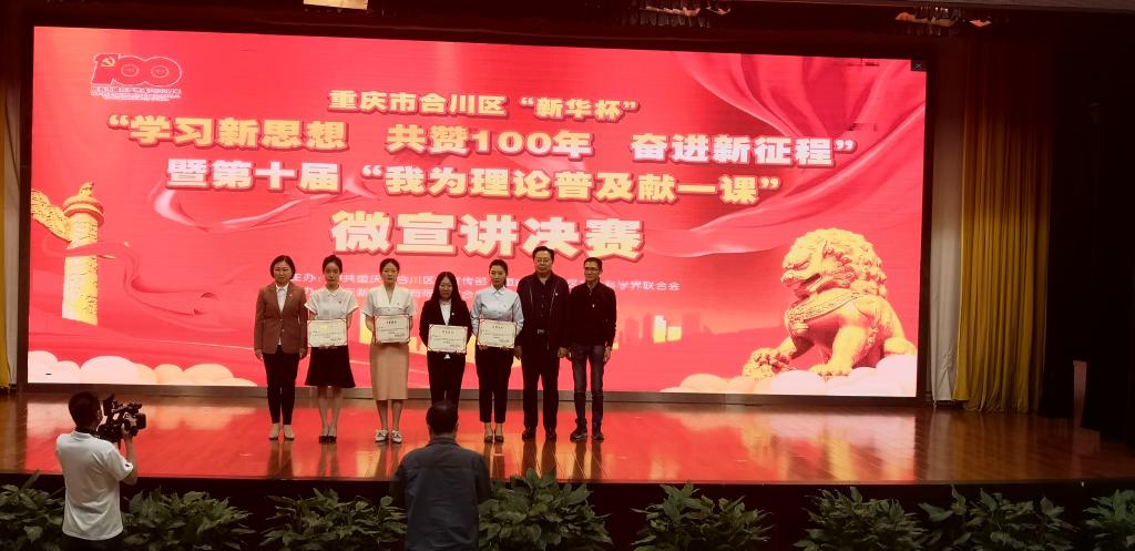 2021年5月25日,我校政治课教学部李婷老师参加了合川区“学习新思想,共赞100年,奋进新征程”暨第十届“我为理论普及献一课”微宣讲活动。经过区委直属机关工委片区、香龙片区、涞滩片区、古楼片区、盐井片区的比赛后,经过评比,筛选出14名选手晋级现场宣讲决赛。李婷老师过关斩将,最后取得决赛三等奖的好成绩。