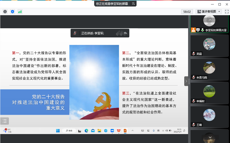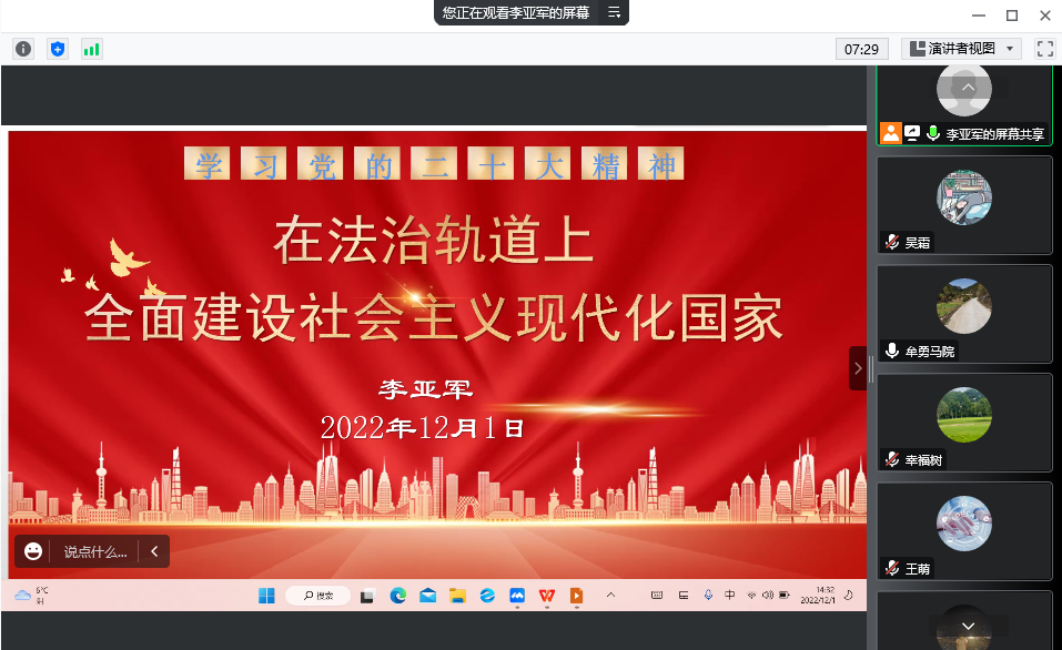 为深入学习贯彻落实党的二十大精神,确保党的二十大精神入脑入心、落地落实,12月1日,马克思主义学院李亚军书记向党员教师作党的二十大精神专题宣讲。因疫情防控,本次宣讲会以线上形式进行。宣讲会由组织委员周红霞老师主持,学院副院长牟勇及马院全体党员教师参加宣讲会。