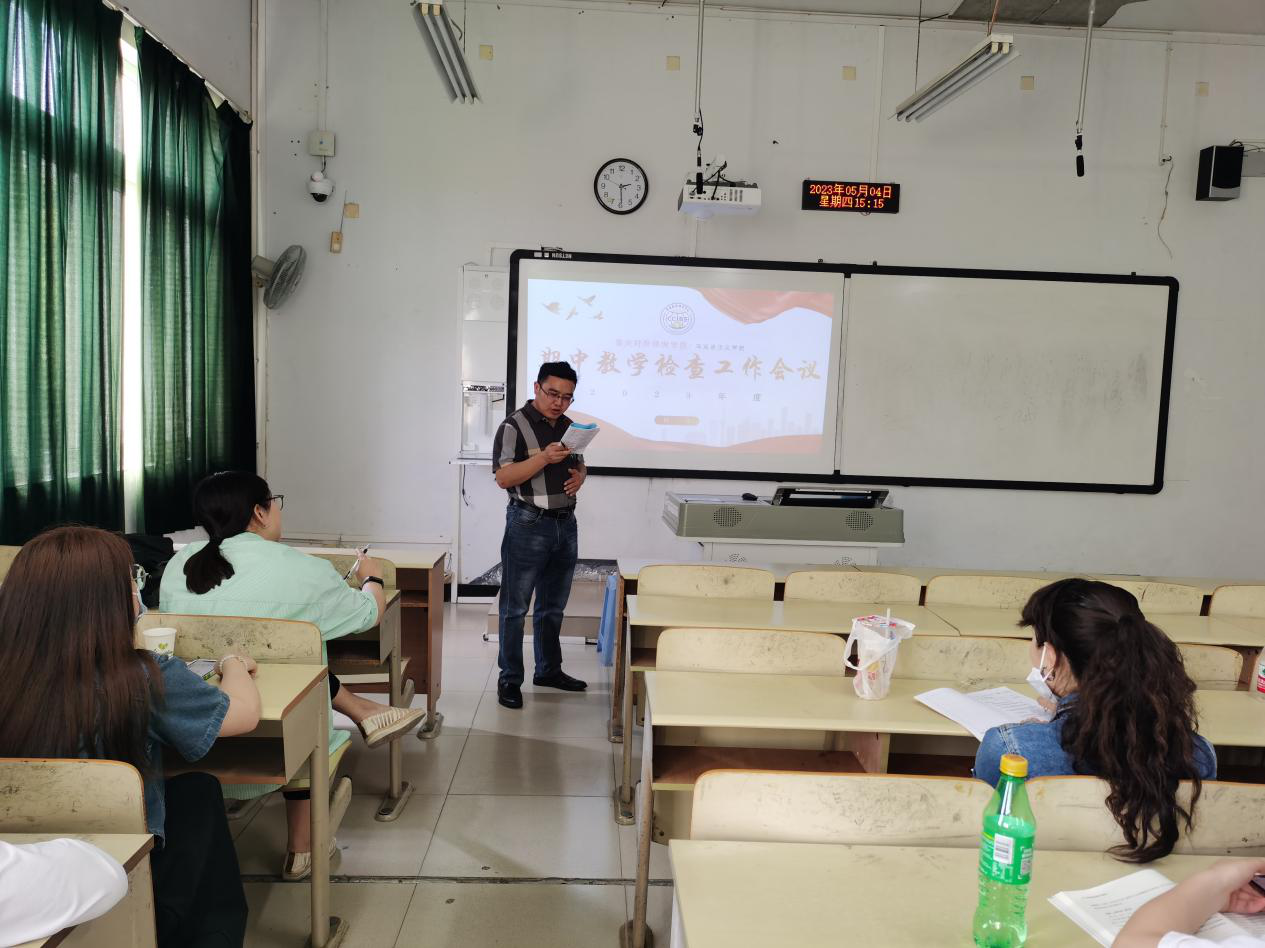 2023年5月4日,马克思主义学院副院长牟勇在1302召开了期中教学检查会议,会议上强调要做到教学管理规范化、教师们要落实创新性要求。