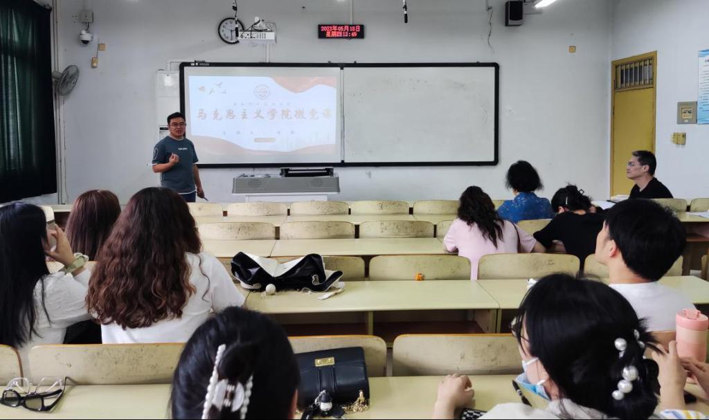 2023年5月18日下午,马克思主义学院直属党支部马克思主义学院直属党支部举行“‘喜迎二十大,建功新时代’人人讲好微党课”主题党日系列活动之微党课。此次微党课由马克思主义副院长牟勇主讲,全体党员教师参加,大家仔细聆听,相互学习、互相启发。