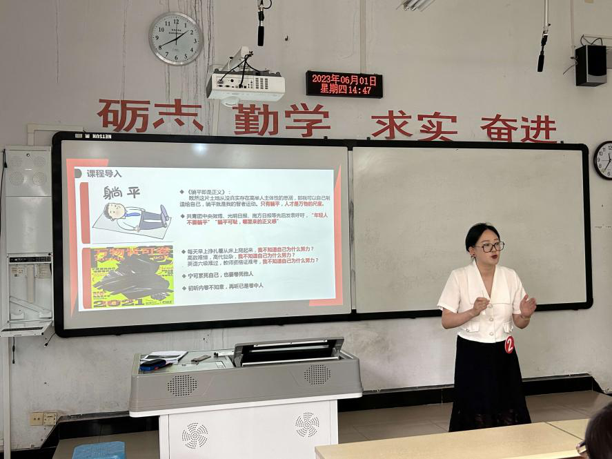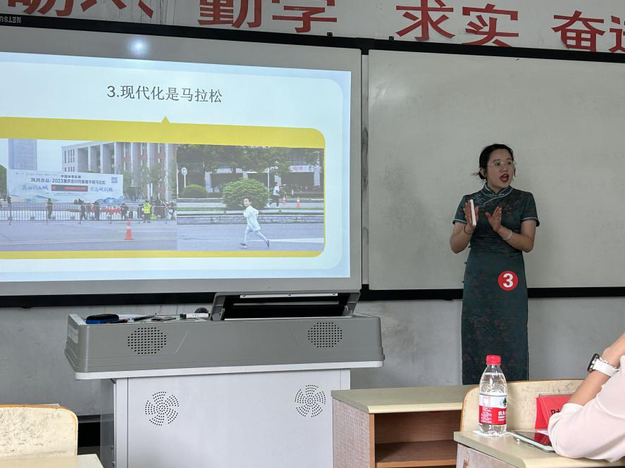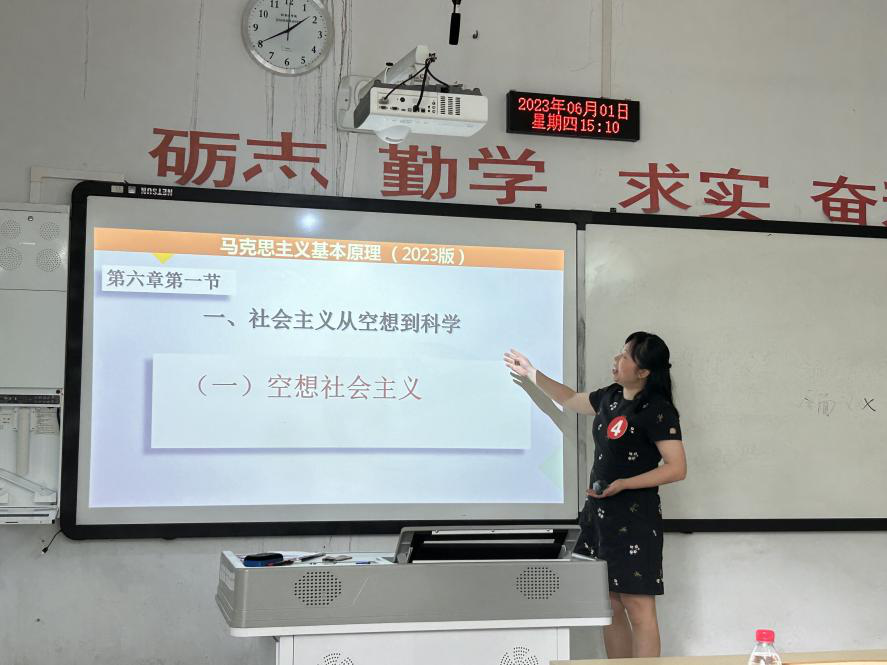 比赛开始,主持人王萌老师介绍了此次比赛的规则:评委评分标准去掉一个最高分和最低分,最后取平均成绩。同时宣布了比赛流程:选手按顺序上台展示授课、评委打分、最后举行颁奖仪式。五位参赛老师依次以生动、精彩地授课形式分别讲解了思政课的热点问题,涵盖教育公平和教育现代化、中国近现代史纲要的基本问题 、中国式现代化的现实路径、社会主义由空想到科学的发展、习近平新时代中国特色社会主义思想的世界观和方法论等方面。