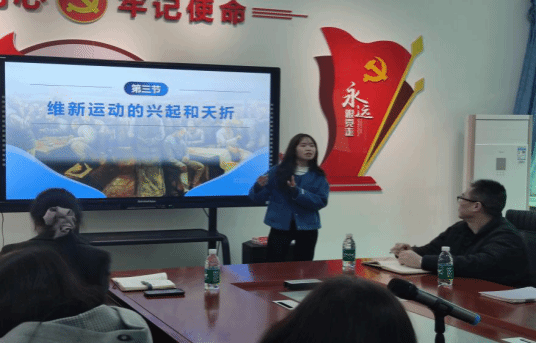 随后2024年新进教师唐丹丹、谭英杰分别就2023版纲要教材第二章第一节“维新运动”和第三章第一节“辛亥革命爆发的历史背景”进行了教学展示。唐老师通过生动案例导入课堂,以活泼的授课风格呈现了历史事件的多维视角;谭老师以一串数字“8 41 13 80 123”进行课堂导入,整体沉稳、且备课较为充分。