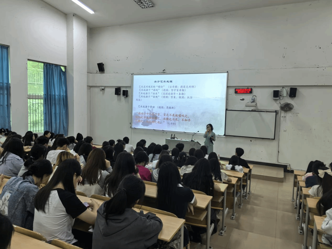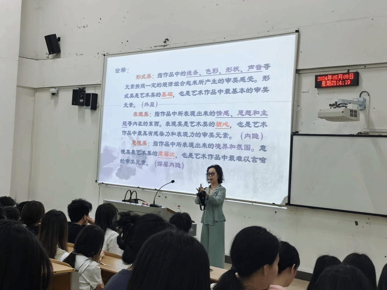 讲座开始,曾鸣副教授从三个板块,详细介绍了中华优秀传统文化中的艺术美本质。讲座中,曾副教授阐释了传统文化的定义与内涵,传统文化的元素和传统文化的现代意义等,结合古诗词,将古典文化中的形式美、表现美、意境美展现出来,从古典音乐、舞蹈、戏曲、传统绘画、传统建筑等方面进行展开讲解,同时以视频、音乐、图片等方式给同学们带来一场精彩的美学视觉盛宴。