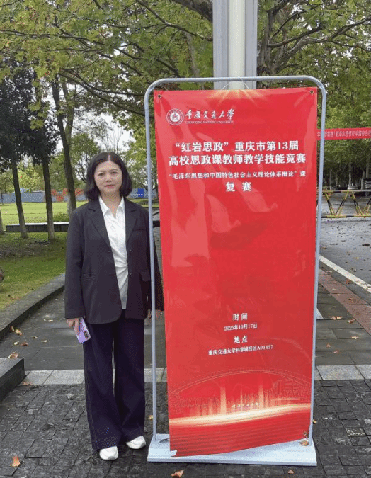 2025年10月17日,“红岩思政”重庆市第13届高校思政课教师教学技能竞赛(“毛泽东思想和中国特色社会主义理论体系概论”课专场复赛)在重庆交通大学举行。我院侯典芬老师代表学校参赛,凭借扎实的理论功底和生动的教学展示顺利完成比赛,充分展现了我校思政课教师的专业素养与风采,自接到参赛任务以来,学院第一时间成立比赛工作组,从资料收集到后勤保障,全程为侯老师提供支持。侯老师则以"赶考"姿态投入备赛,多次邀请校内外专家进行指导,反复修改讲稿,力求每一个细节都精益求精。