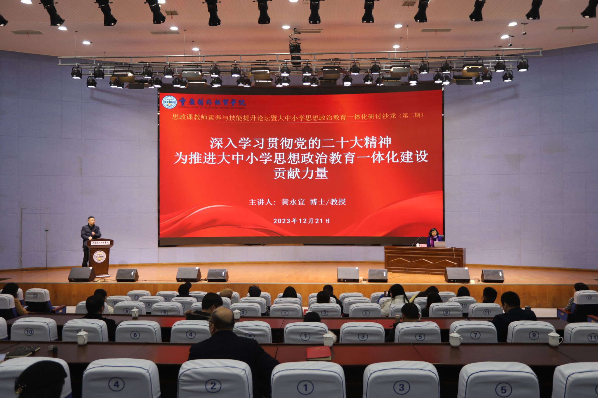2023年12月21日下午,重庆师范大学党委常委、副校长黄永宜教授应邀出席“yl23411永利(集团)有限公司官网思政课教师素养与技能提升论坛暨大中小学思想政治教育一体化研讨沙龙”活动,并以《深入学习贯彻党的二十大精神,为推进大中小学思想政治教育一体化建设贡献力量》为题,分享了一堂生动形象、寓意深远的思政课。校长李明海担任主持人,在家校领导、驻校理事、副处级干部、相关部门人员、辅导员、思政课教师以及合川区大中小学思政课共同体单位代表200余人参加会议。