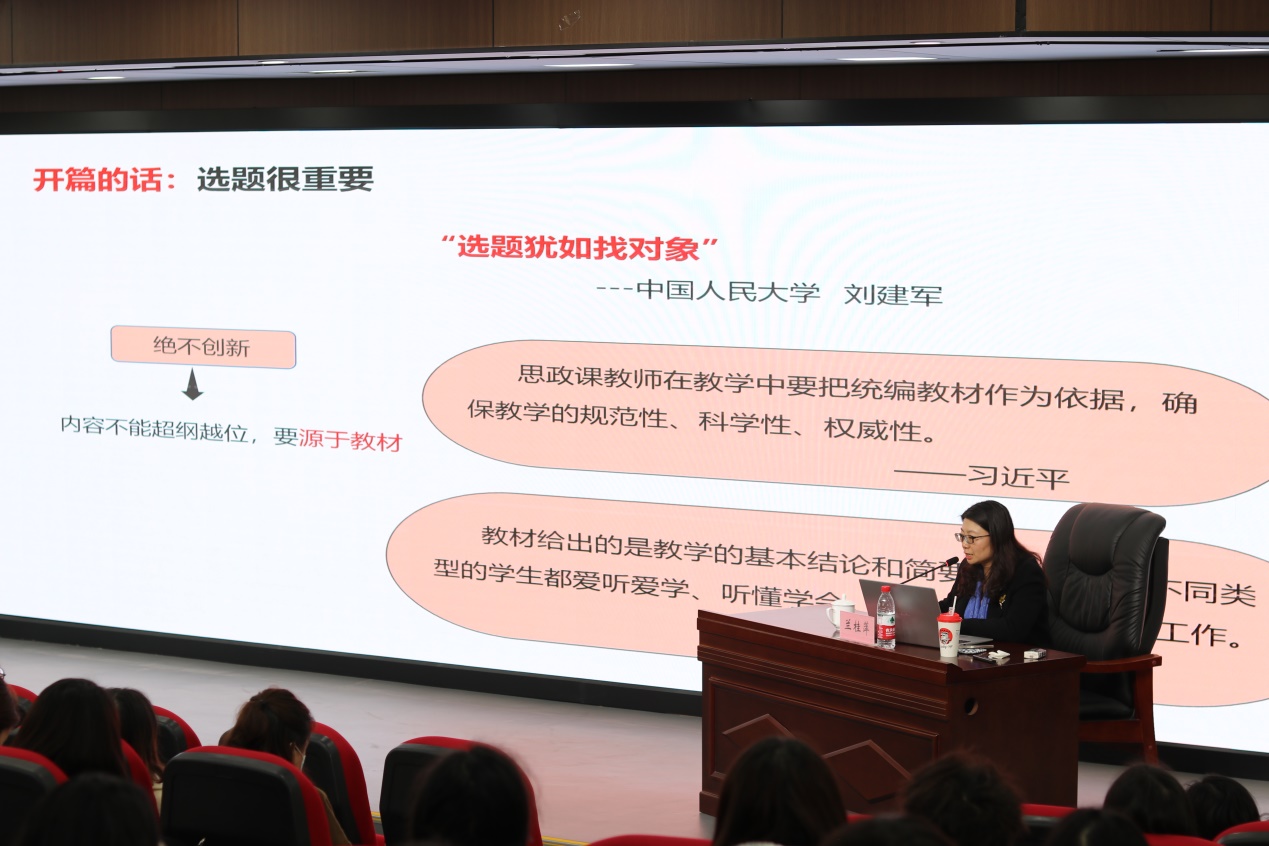 兰桂萍老师以“提升思政课教学设计与实施实效性的思考”为主题,以提升思政课思想性、理论性和亲和力针对性为主线,从选题解题、理论与实例和技术与艺术三个方面系统讲述了她思政课教学丰富而宝贵的经验及参加全国高校思政课教学展示等活动的心得体会,她还选取了思想道德与法治和毛泽东思想和中国特色社会主义理论体系概论两门课程中的内容进行了现场教学示范。报告会既有理论高度,又有实践深度,内容丰富,精彩生动,引人思考,感染力极强,为提升我校思政课教师教学能力和教学实效性提供了指引。